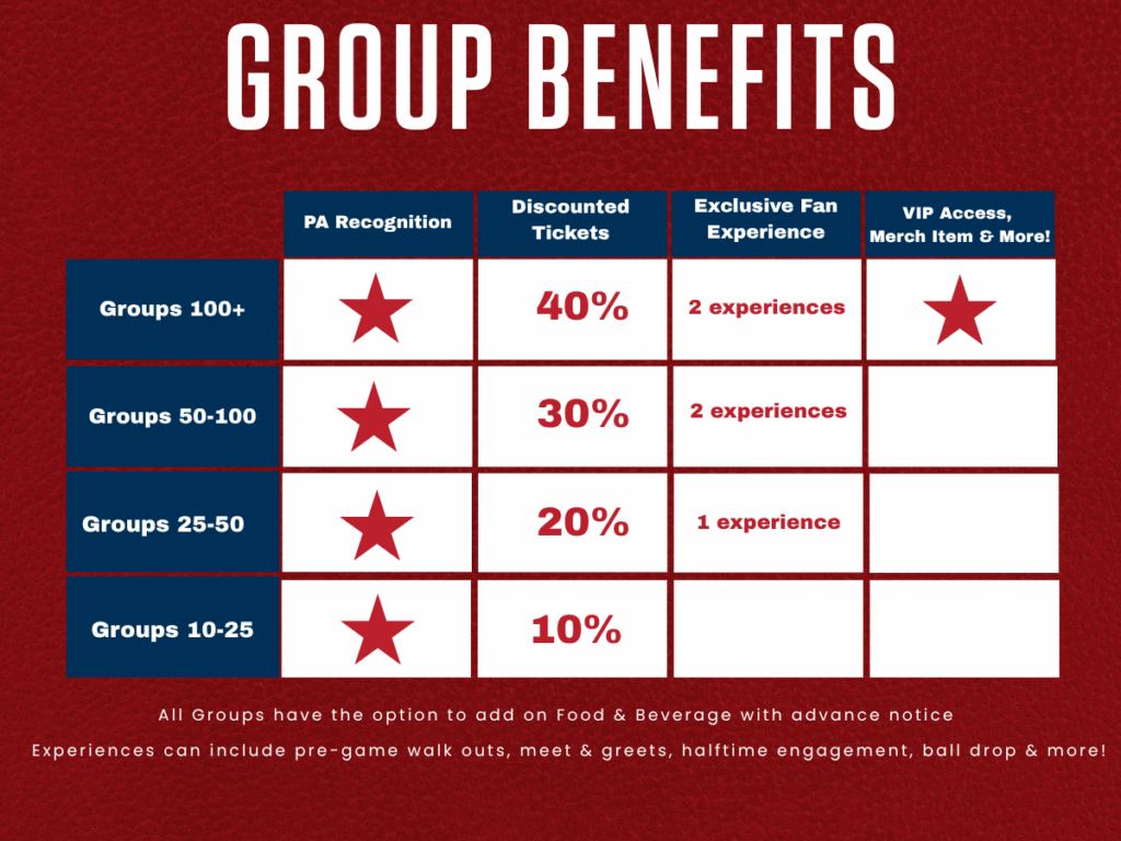 Old Glory has something for everyone! Groups of 10 or more can enjoy discounts and matchday perks. Plus, large groups can get up to 40% off regular-priced tickets.